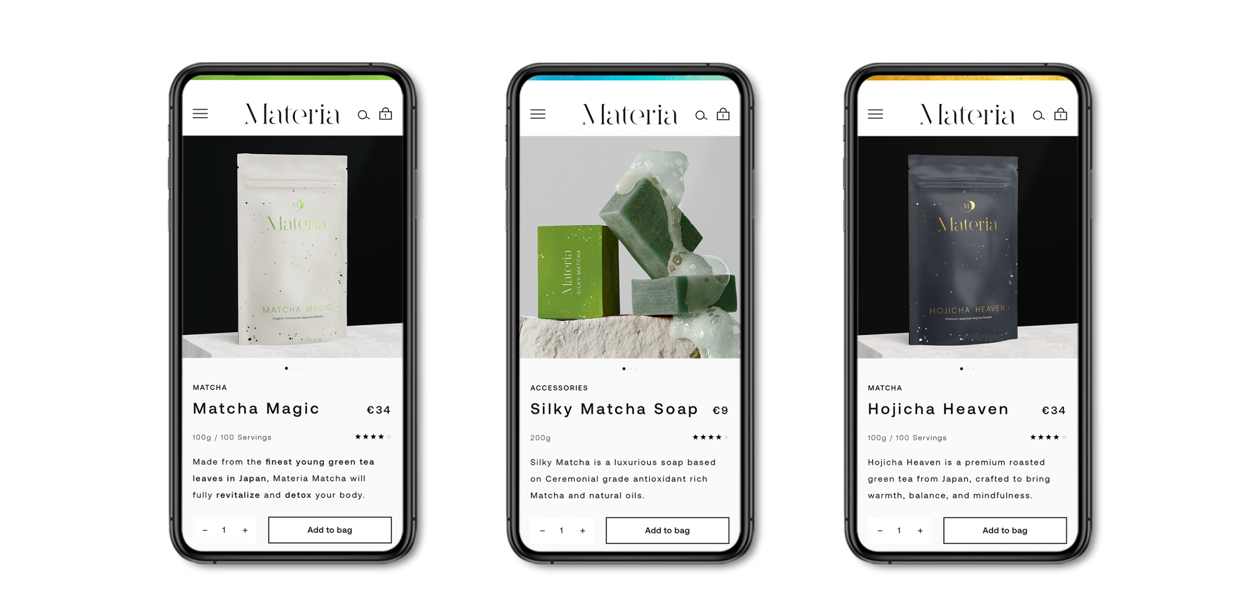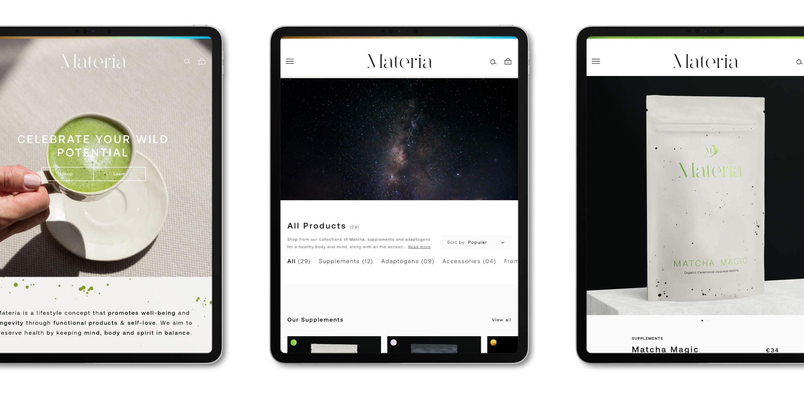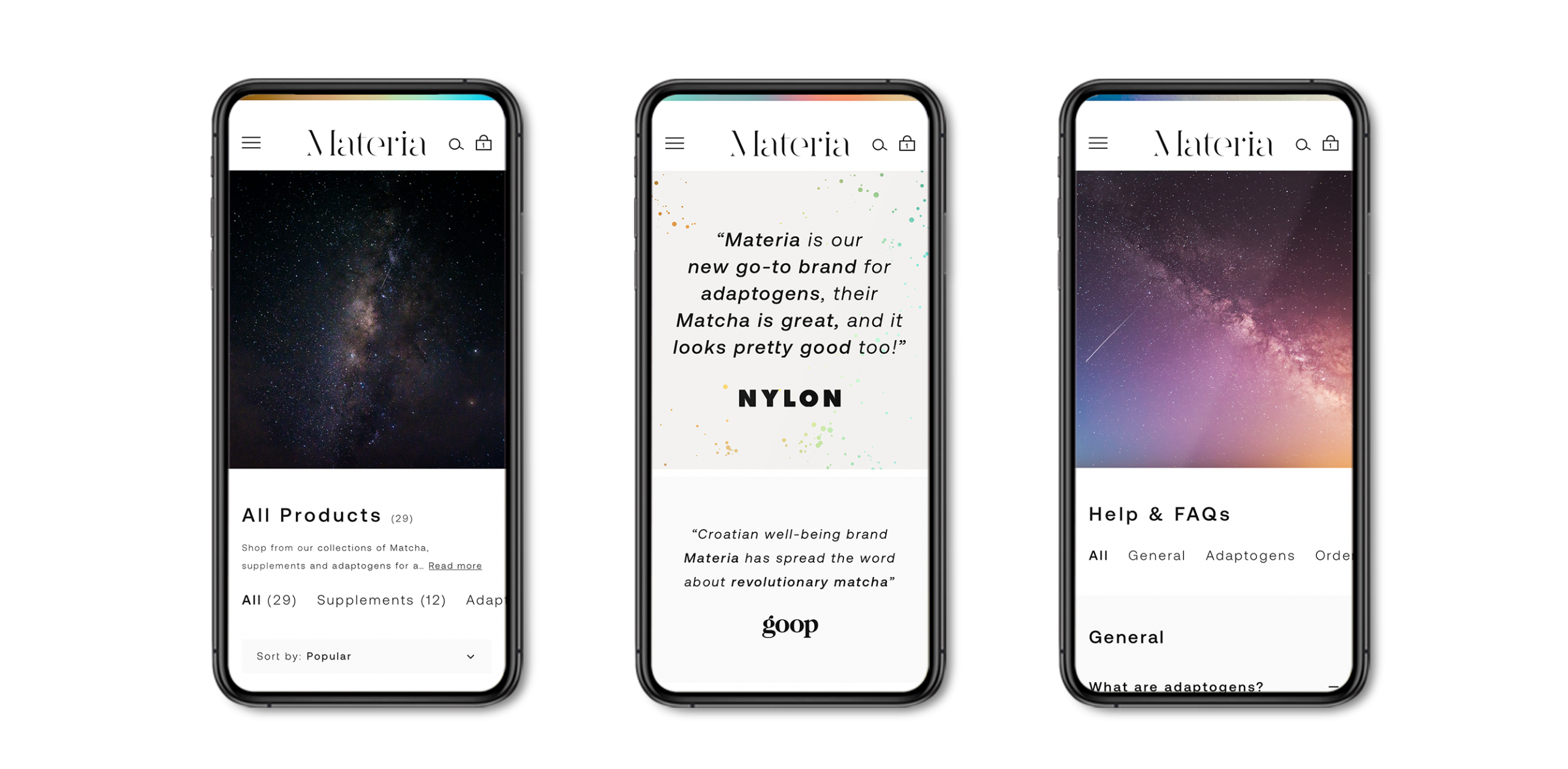 When I was approached by Maja, the founder of Materia, the goal was clear. To create a brand that encompassed all of her values both in visual and verbal tone of voice, and combine them into a complete eco-system that comprised of brand and digital strategy, branding, packaging, print and responsive web design. The result combines approachability with premium cleanliness and use of space. Refined but with personality. An ethereal themed marque and brand speckle pattern based on constellations ties the packaging and web together, and also underpins digital assets for a consistent visual language. Product names and straplines like ‘Oh Honey Honey’ and ‘We love you so Matcha’ layer personality into the mix, with subtle animation applied to digital touchpoint to punch up the user experience.